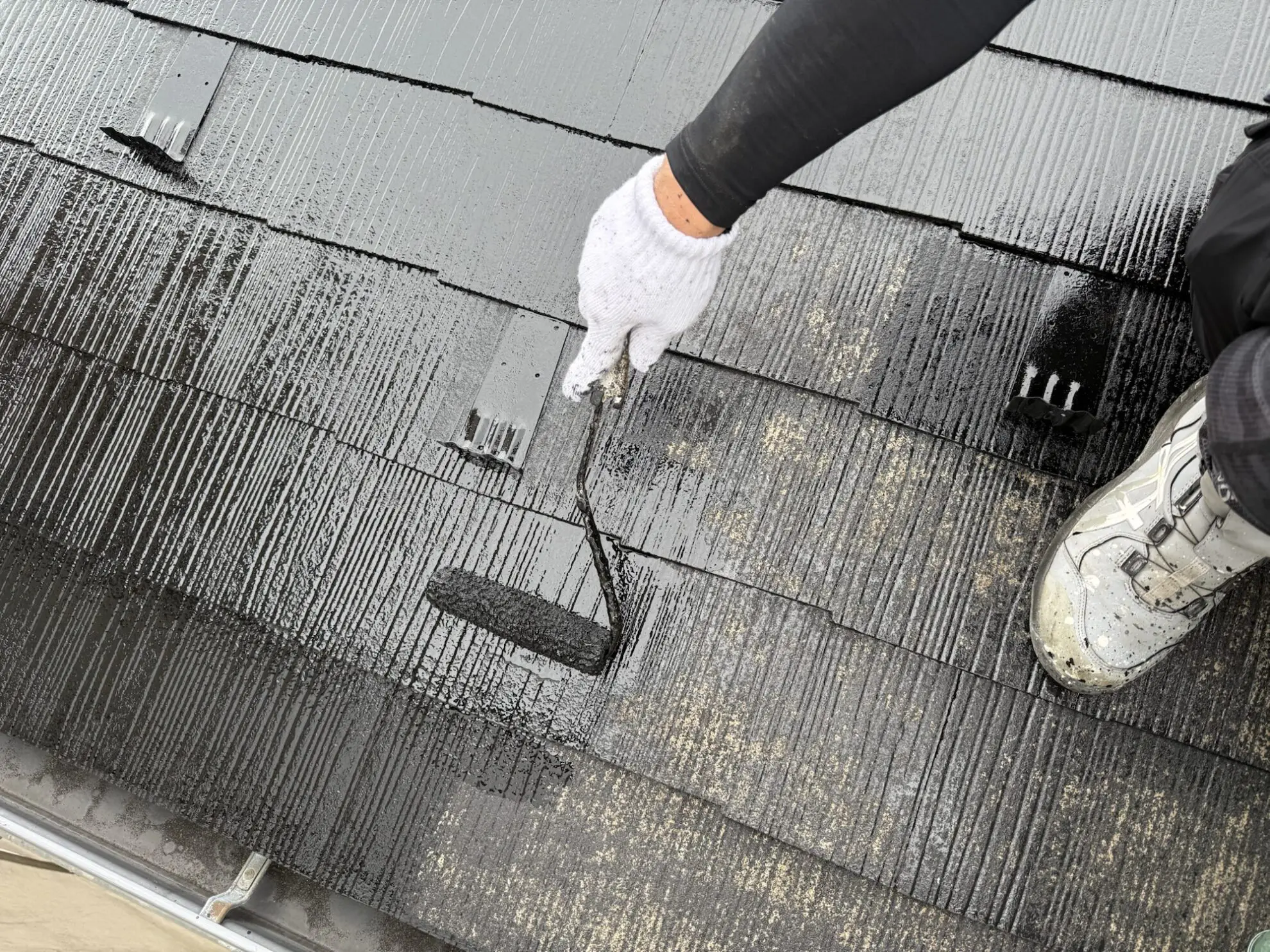 塗装前と比べて屋根全体が均一な色になり、艶が増しているのが分かります。下塗りで整えた下地にしっかりと中塗りが定着し、次の上塗り工程に向けて理想的な仕上がりとなっています。